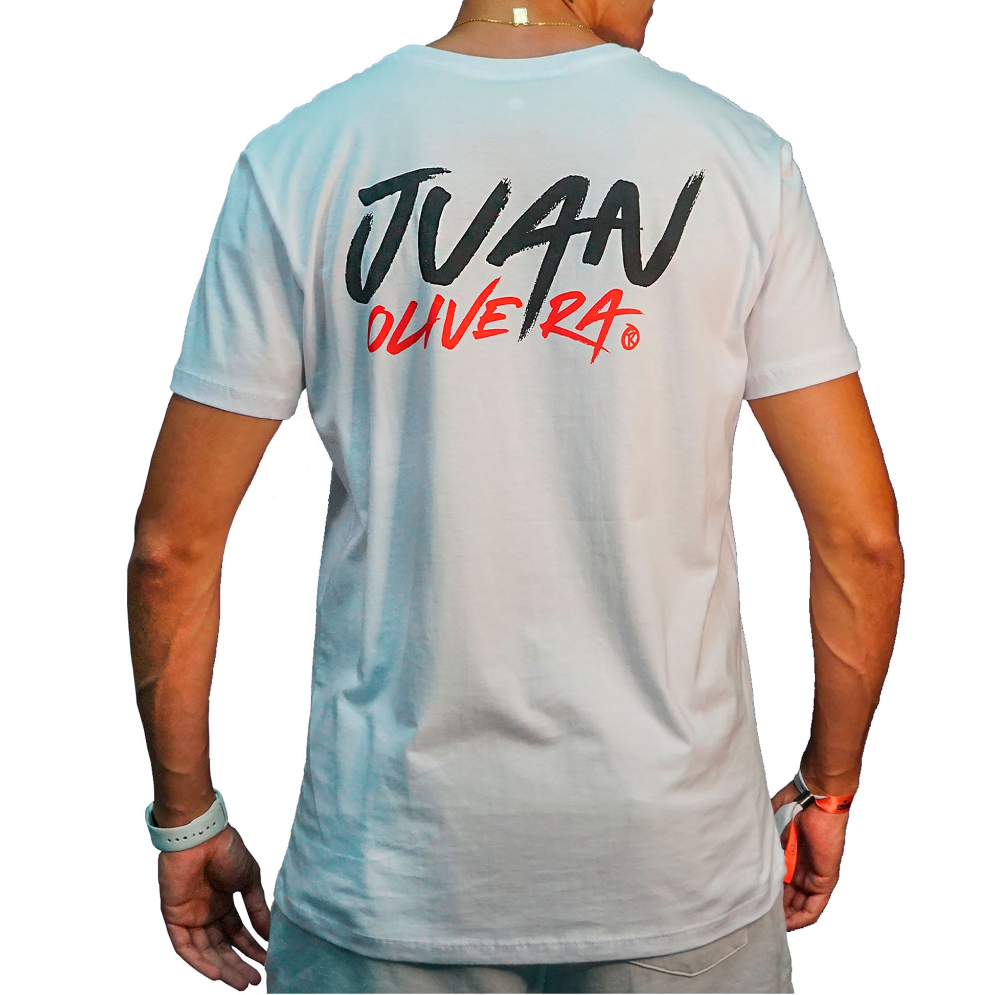 Camiseta coleção Juan Oliveira estampada nas costas, 100% algodão.